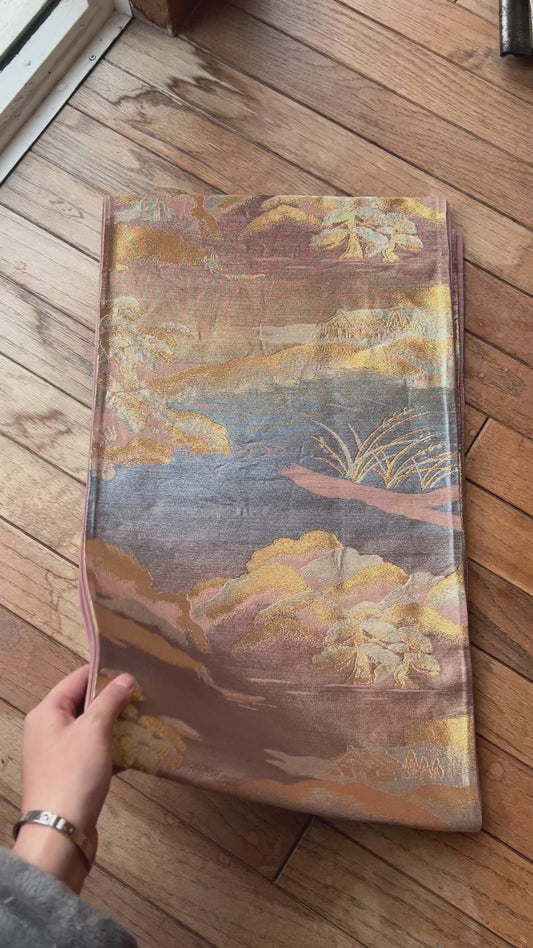 FORTUNE COOKIE BAG (S) <metallic ash pink×blue landscape pattern > Upcycled from pre loved obi