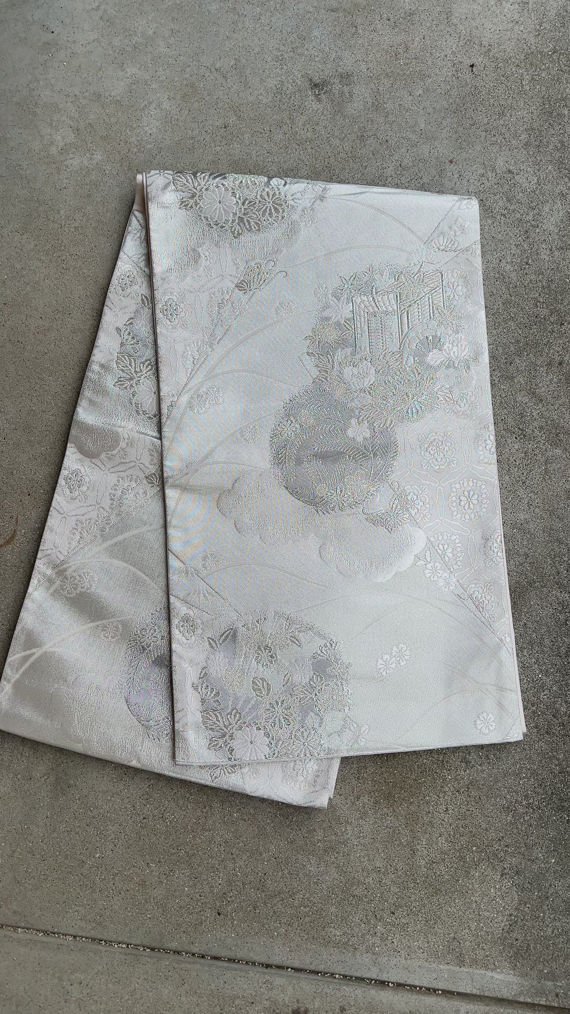 <FORTUNE COOKIE BAG (L) <silver multi flower motifs > Upcycled from silk obi