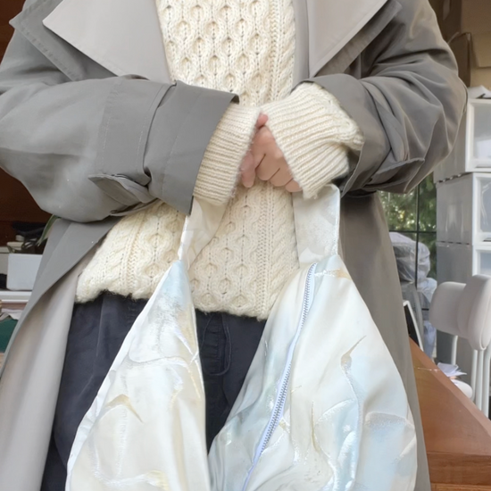 FORTUNE COOKIE BAG (S) <off white with a hint of light blue Japanese crane pattern> Upcycled from silk obi