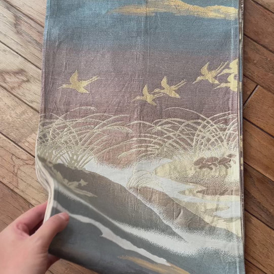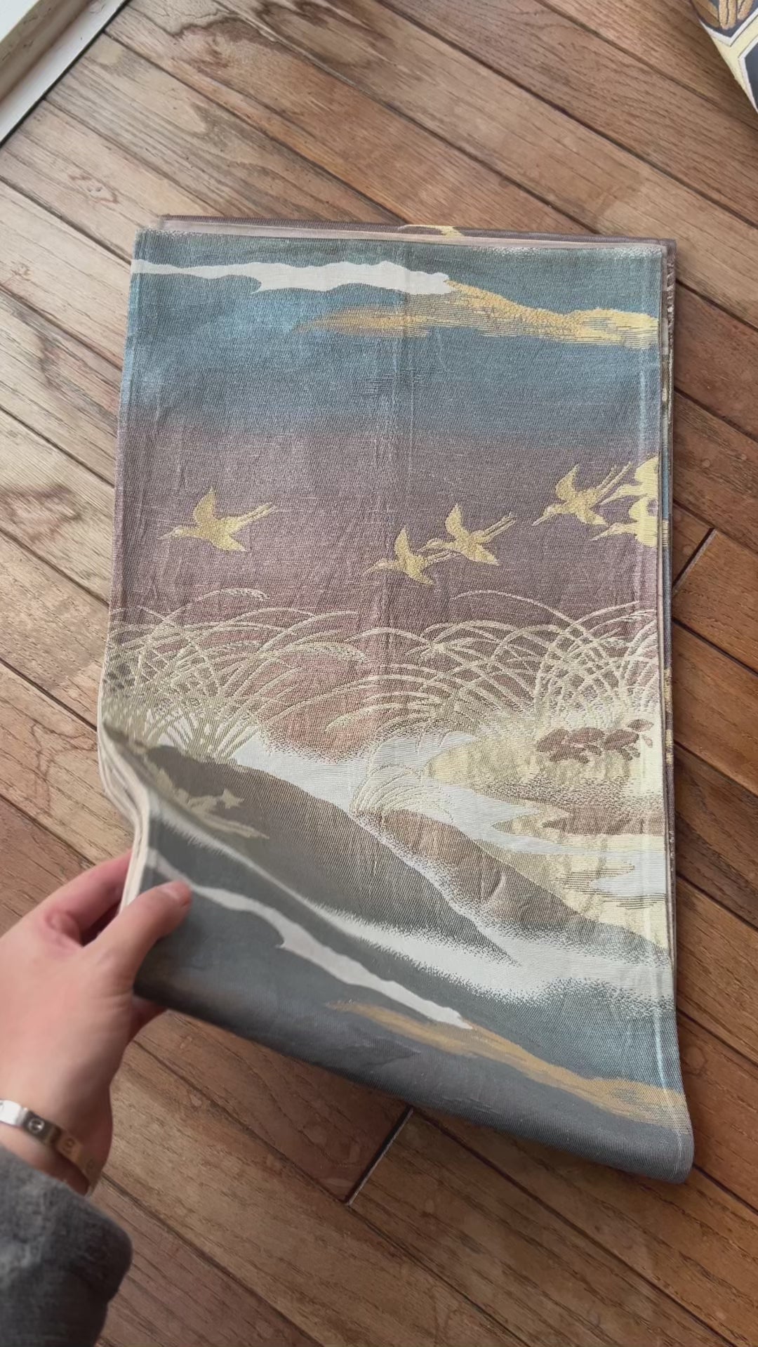 FORTUNE COOKIE BAG (S) <metallic light purple×blue landscape with bird pattern > Upcycled from pre loved obi