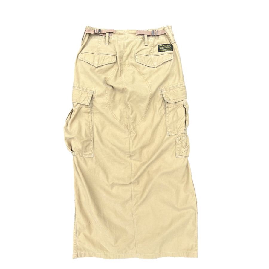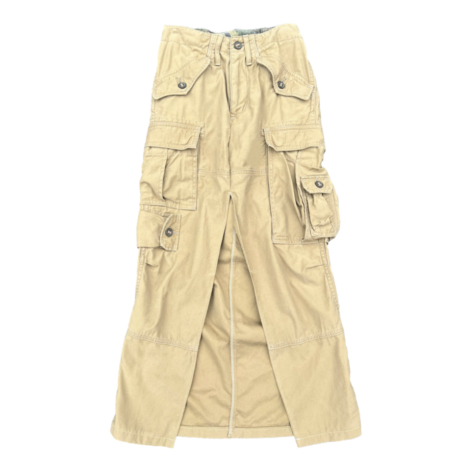 Upcycled from cargo pants to a cargo skirt with a slit.