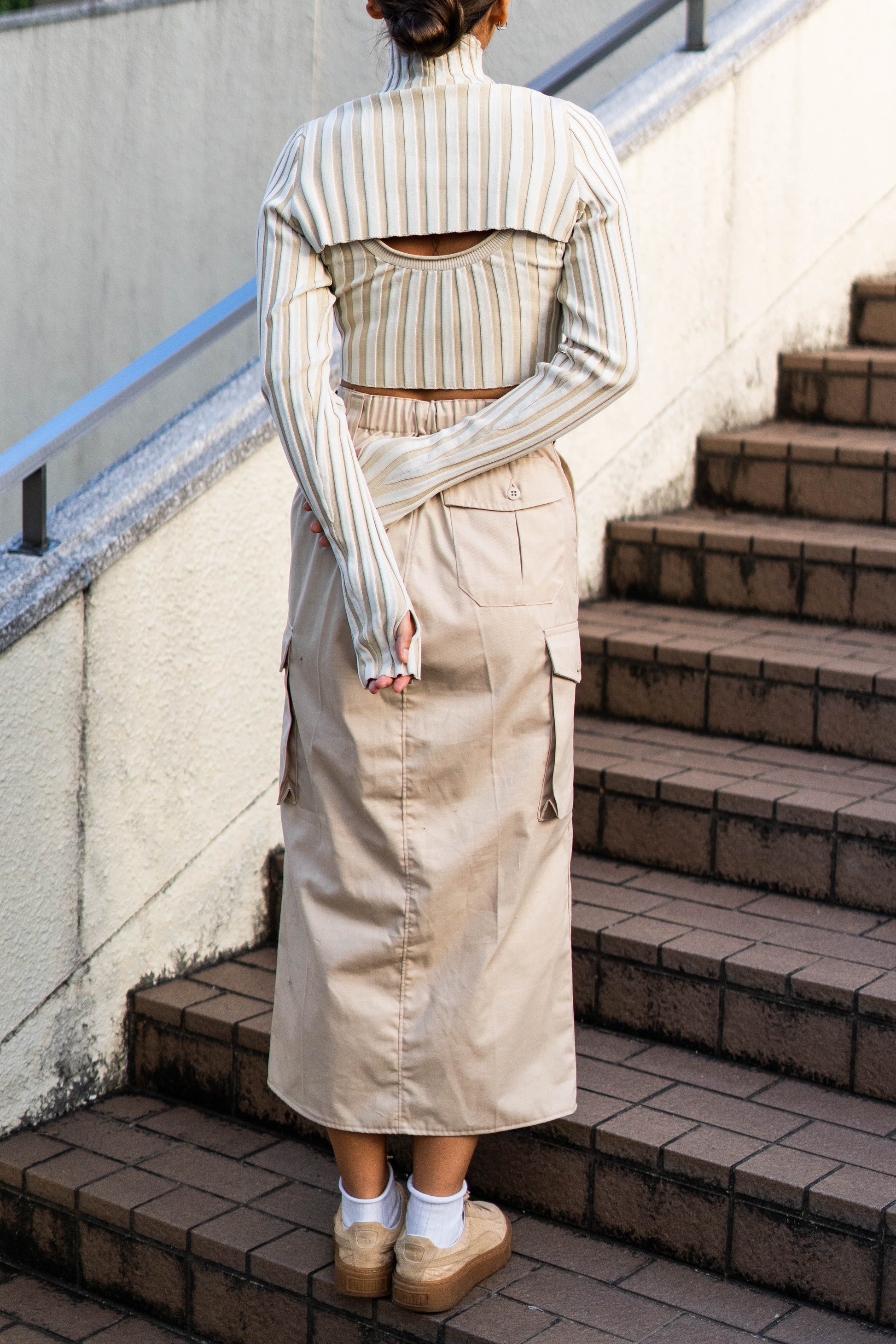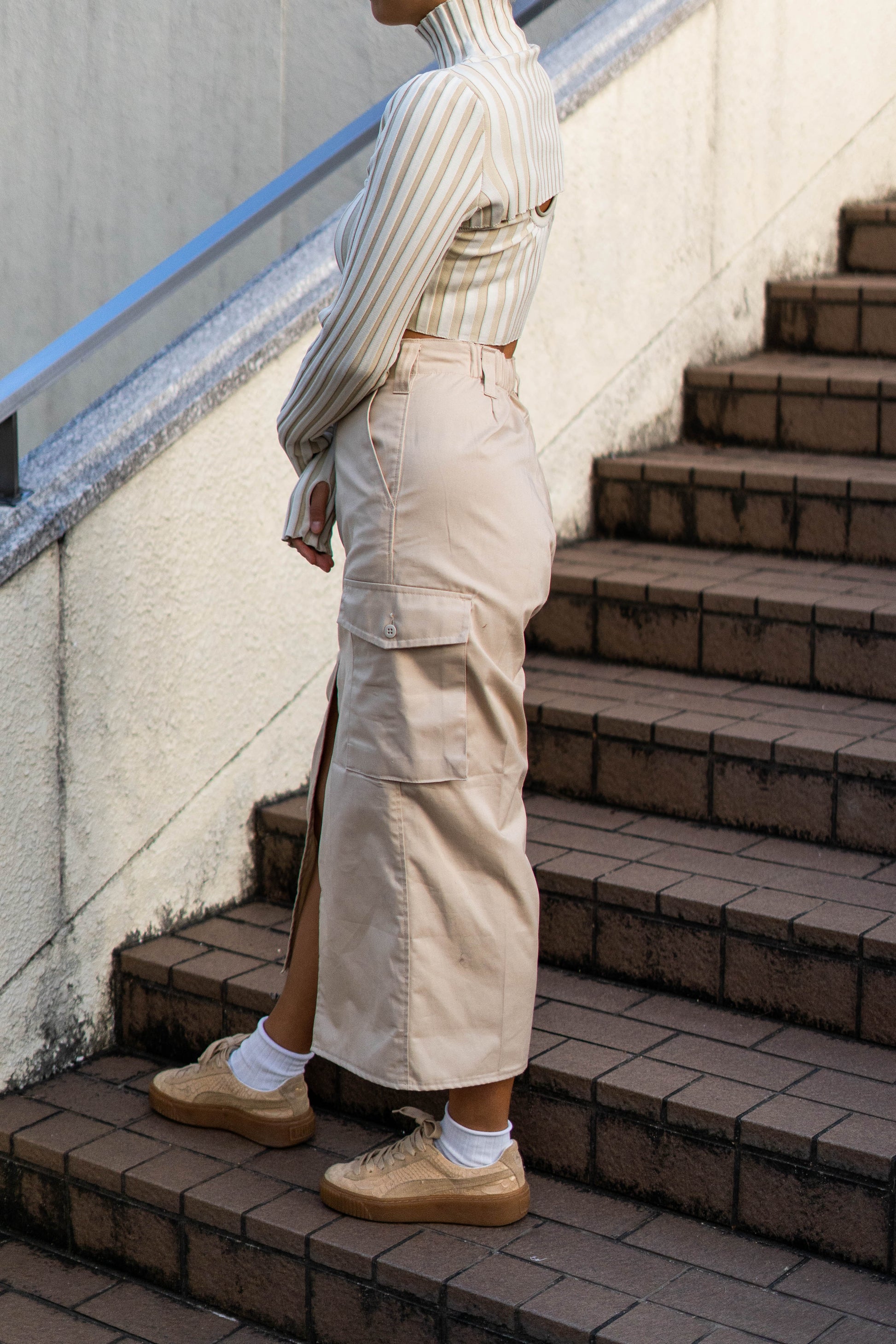 Upcycled from cargo pants to a cargo skirt with a slit.